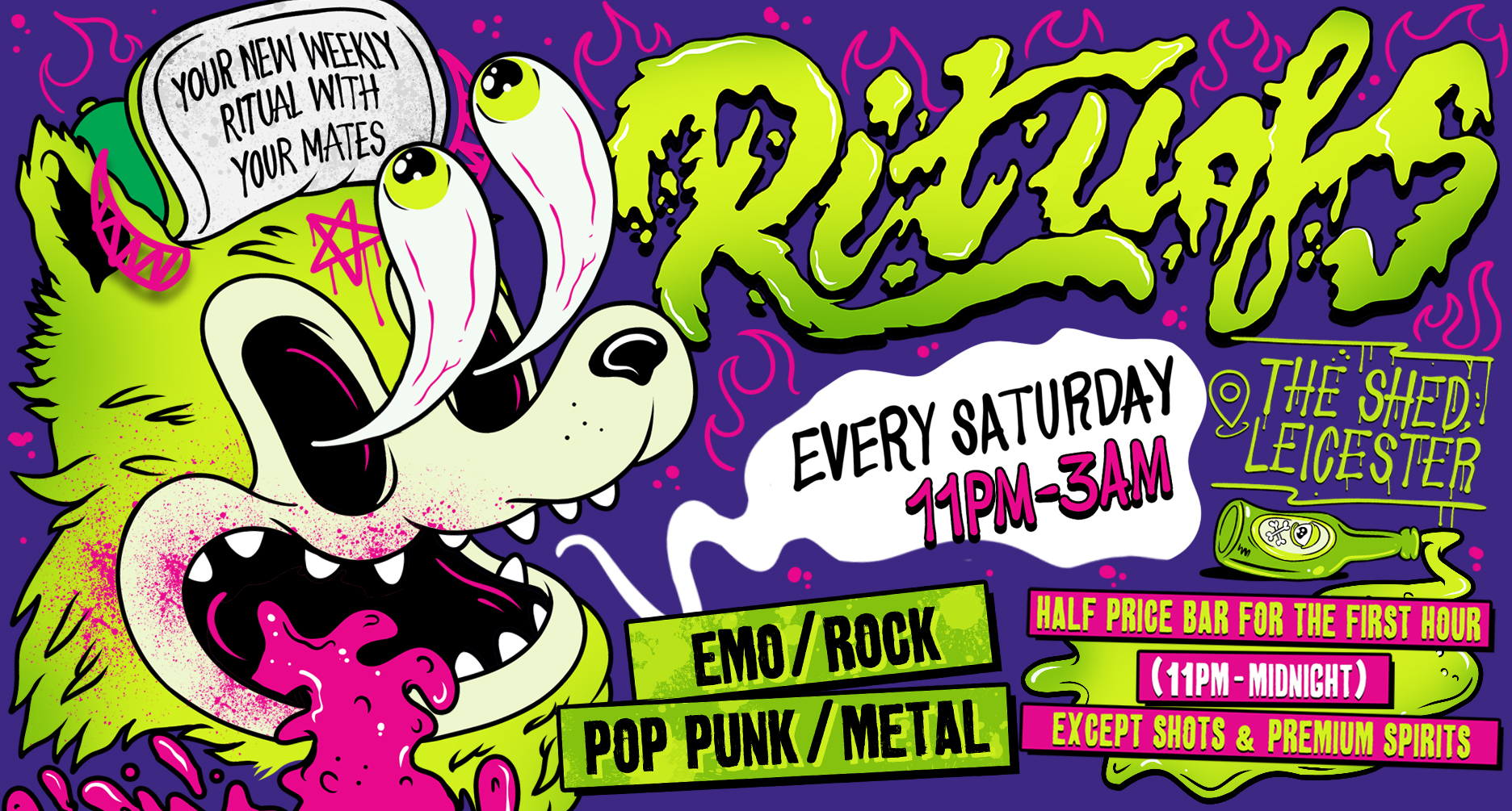 RITUALS is a weekly alternative club night held every Saturday at The Shed in Leicester, running from 11pm to 3am. Created by Panic Presents, the team behind Panic At The Emo and Parasite Eve, the night blends alt, emo, metal and pop punk with an exciting club atmosphere. Guests arriving between 11pm - 12am can enjoy half-price drinks for the first hour (excluding shots and premium).
