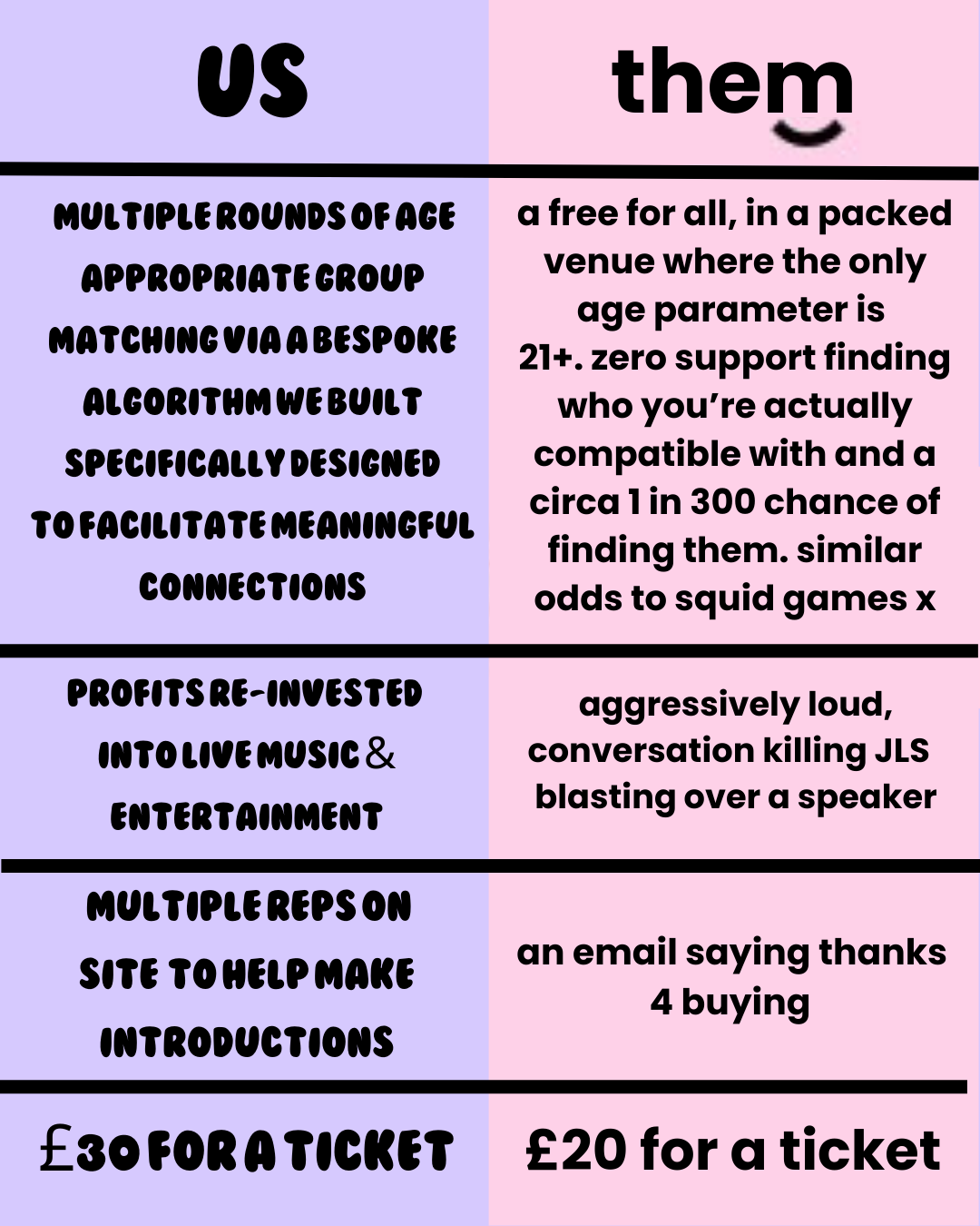 There’s a huge amount of work behind the scenes before events to get everyone matched into great groups. If you need to transfer your ticket to a friend, we do ask please that you pop us an email with their name 7 days before an event so we can move things around. As with every other events company in our space, we are unable to facilitate refunds but we will always do our 100% best to find a solve!x