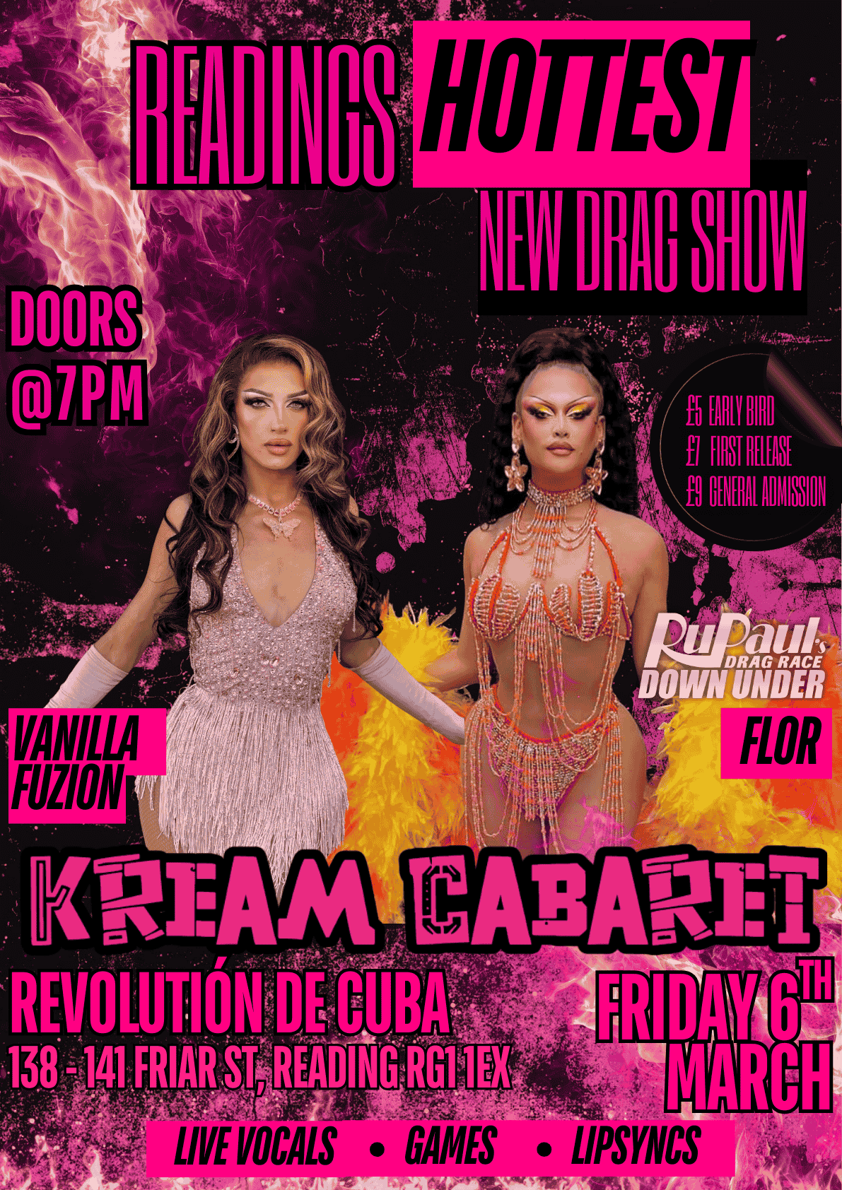Get ready for a night of pure drag excellence at Kream Cabaret, bringing high-energy performances, fierce fashion, and unapologetic glamour to Revolución de Cuba, Reading.